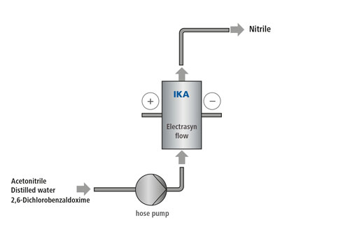 55 ml of acetonitrile are mixed with 5 ml of distilled water in a suitable vessel and then 1.38 g (7.26 mmol) of 2.6 dichlorobenzaldoxime is stirred in. The solution must be absolutely free of solid components before being pumped into the system. The structure of the cell system begins with the cell: A half cell with graphite electrode is used as the anode. On the cathode side, a lead-bronze electrode is used. When the cell is completely assembled, the stand, hoses, power supply and pump are connected accordingly. The current density in this synthesis is 5 mA/cm2, which corresponds to a current of 60 mA. The voltage can be set to the maximum, as it automatically adjusts to the electrical resistance of the system. The pump is set to a flow rate of 8.5 ml/min. or 0.142 ml/sec. The product leaving the cell differs from the reagent since it is slightly yellow. Further information on the preparing and processing the product solution can be found at: C. Gütz, A. Stenglein, S. R. Waldvogel, Highly Modular Flow Cell for Electro-Organic Synthesis, Org. Process Res. Dev. 2017, 21, 771–778. [DOI: https://pubs.acs.org/doi/abs/10.1021/acs.oprd.7b00123 ] |