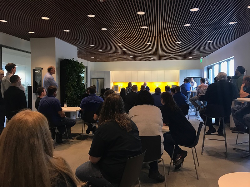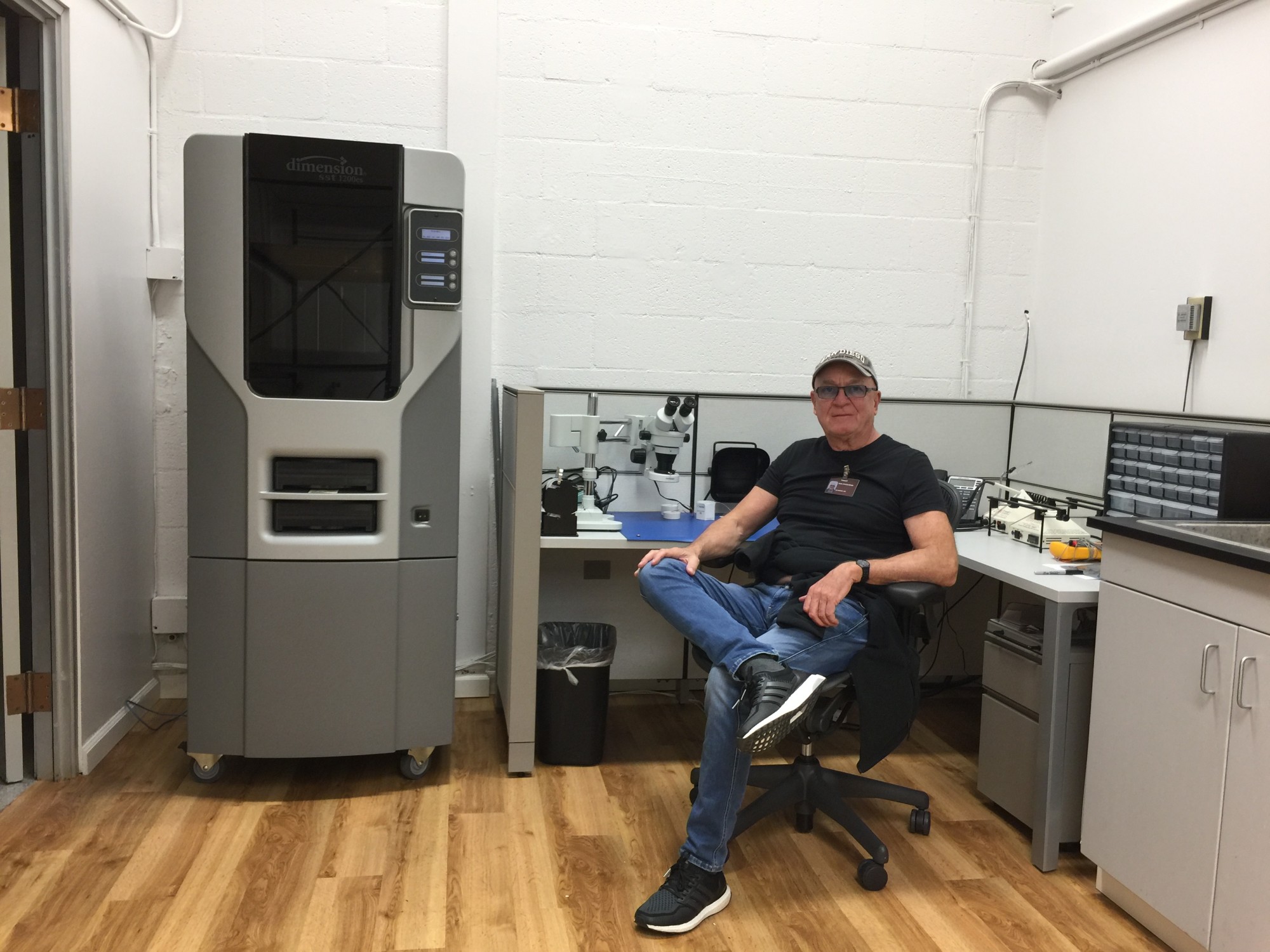 Mr. Stiegelmann is pictured in the service and warehouse area currently used for soldering components and equipped with the 3D printer. While visiting in San Diego, Mr. Stiegelmann met with the local staff.