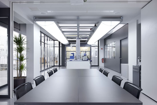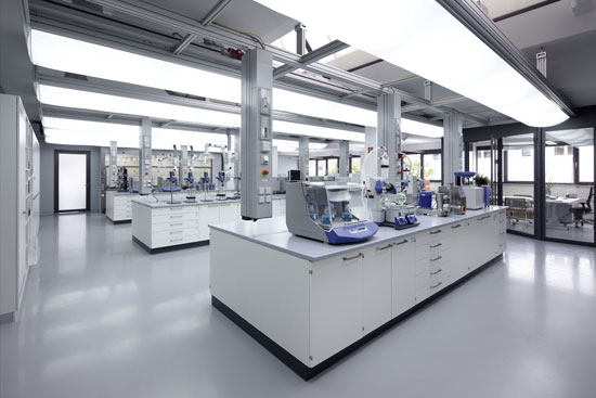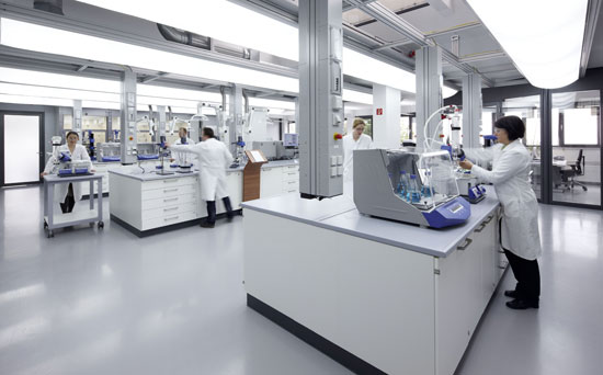 The use of lighting and open air design provide for a very modern environment while ensuring safe working conditions without drafts. The climatization guarantees a consistent lab temperature of 22 degrees – a requirement for reproducible experiments. For its test series, the Application Center is connected to automated storage facilities. The modern fume hoods offer safe working conditions, even with difficult samples.